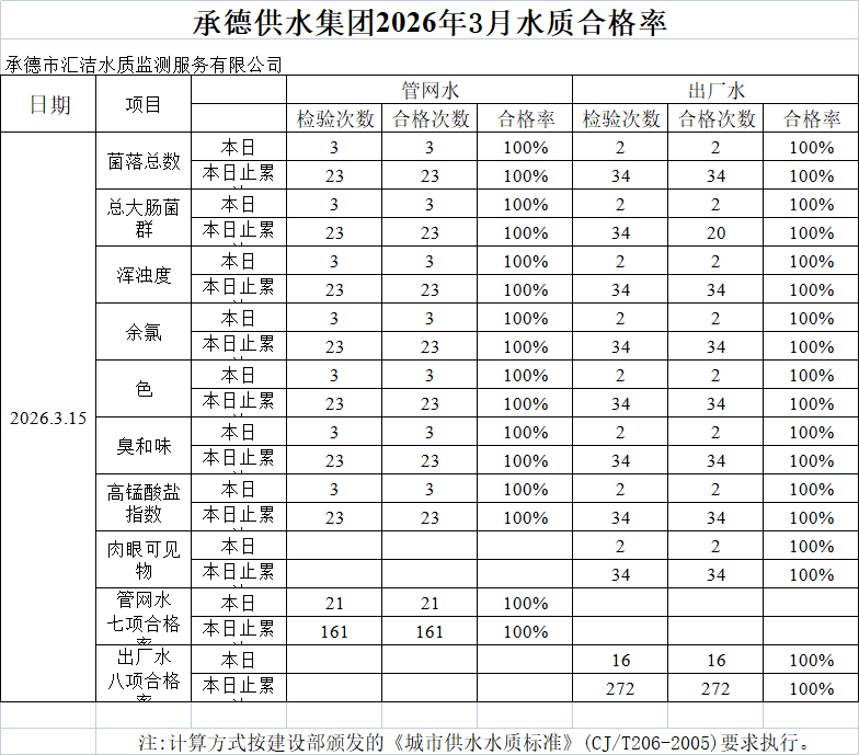 承德供水集團(tuán)2026年3月15日水質(zhì)合格率