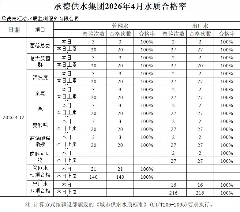 承德供水集團2026年4月12日水質(zhì)合格率